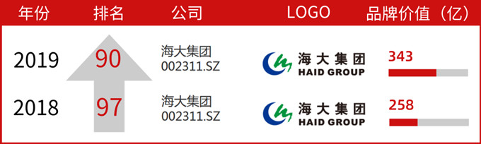 海大集團(股票代碼:002311.SZ)與騰訊控股、阿里巴巴等企業(yè)共同上榜“2019中國上市公司品牌價(jià)值榜”總榜TOP100,排名90位,品牌價(jià)值343億元,相比2018年名次提升了7位,品牌價(jià)值增長(cháng)30%,在農牧行業(yè)排名僅次于溫氏股份和新希望,排名第三。