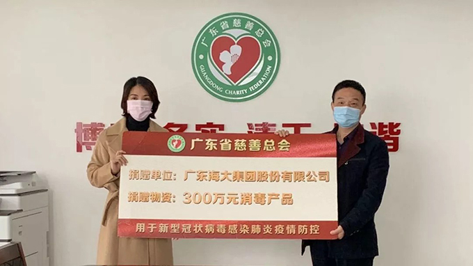連日來(lái),新型冠狀病毒感染的肺炎疫情發(fā)展形勢嚴峻,持續成為全國人民聚焦的頭等大事。即使山水相隔、封路封城,也未能阻擋舉國上下同舟共濟、鼎力相助的力量。2月11日,廣東省慈善總會(huì )常務(wù)副會(huì )長(cháng)、秘書(shū)長(cháng)鐘曉明為海大集團捐贈300萬(wàn)元消毒物資正式授予捐贈證書(shū)。