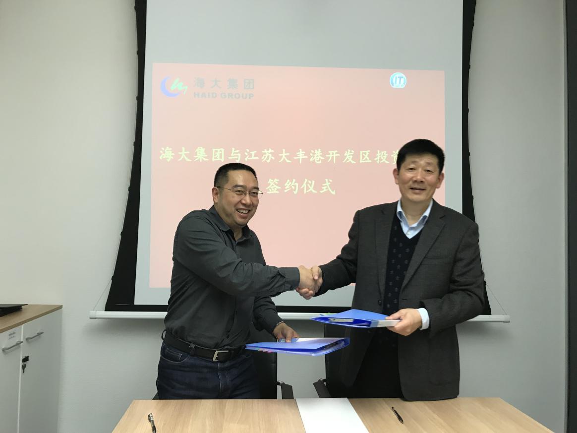 3月6日,江蘇省鹽城市大豐港經(jīng)濟開(kāi)發(fā)區管理委員會(huì )副主任袁宏 、鹽城市大豐區人民政府境外招商二局科長(cháng)唐春銀一行到訪(fǎng)海大集團總部進(jìn)行考察,并簽定年產(chǎn)24萬(wàn)噸生物飼料生產(chǎn)項目投資協(xié)議,項目用地60畝,建成達產(chǎn)后可實(shí)現產(chǎn)值6億元。